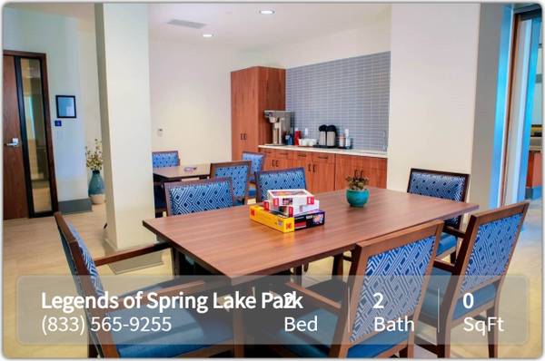 Affordable Apartment Homes for Adults 55 and Older. People love Spring Lake Park's small town charm, friendly people, and close-in location! This incredible active living community for adults 55 and older provides luxurious amenities that set the standards for quality and affordability in the North Metro. The Legends of Spring Lake Park offers 1, 2, and 3 bedroom floor plans that feature a full-size washer and dryer in every apartment, walk-in closets, granite countertops and more. Other amenities include heated underground parking, community kitchen, fitness center, card & craft room, on-site theater room, and even a beauty salon. Its the perfect combination of luxury and affordability! *The Legends Of Spring Lake Park participates in an affordable housing program. Household income & student status limitations apply. Please call for more details.