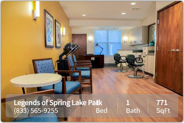Affordable Apartment Homes for Adults 55 and Older. People love Spring Lake Park's small town charm, friendly people, and close-in location! This incredible active living community for adults 55 and older provides luxurious amenities that set the standards for quality and affordability in the North Metro. The Legends of Spring Lake Park offers 1, 2, and 3 bedroom floor plans that feature a full-size washer and dryer in every apartment, walk-in closets, granite countertops and more. Other amenities include heated underground parking, community kitchen, fitness center, card & craft room, on-site theater room, and even a beauty salon. Its the perfect combination of luxury and affordability! *The Legends Of Spring Lake Park participates in an affordable housing program. Household income & student status limitations apply. Please call for more details.