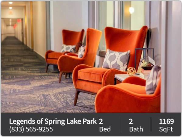 Description........ Affordable Apartment Homes for Adults 55 and Older. People love Spring Lake Park's small town charm, friendly people, and close-in location! This incredible active living community for adults 55 and older provides luxurious amenities that set the standards for quality and affordability in the North Metro. The Legends of Spring Lake Park offers 1, 2, and 3 bedroom floor plans that feature a full-size washer and dryer in every apartment, walk-in closets, granite countertops and more. Other amenities include heated underground parking, community kitchen, fitness center, card & craft room, on-site theater room, and even a beauty salon. Its the perfect combination of luxury and affordability! *The Legends Of Spring Lake Park participates in an affordable housing program. Household income & student status limitations apply. Please call for more details.