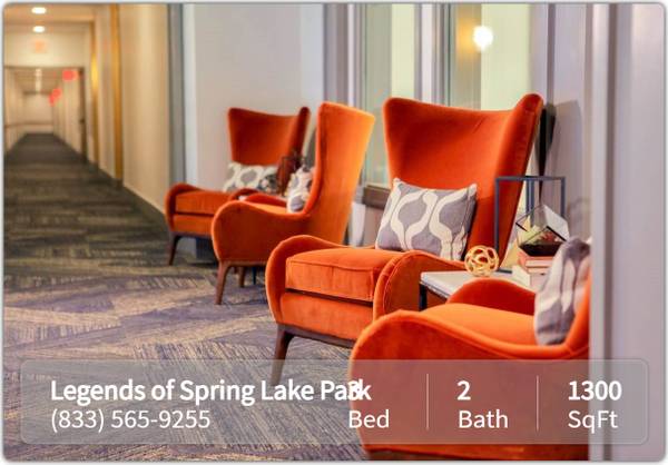 Affordable Apartment Homes for Adults 55 and Older. People love Spring Lake Park's small town charm, friendly people, and close-in location! This incredible active living community for adults 55 and older provides luxurious amenities that set the standards for quality and affordability in the North Metro. The Legends of Spring Lake Park offers 1, 2, and 3 bedroom floor plans that feature a full-size washer and dryer in every apartment, walk-in closets, granite countertops and more. Other amenities include heated underground parking, community kitchen, fitness center, card & craft room, on-site theater room, and even a beauty salon. Its the perfect combination of luxury and affordability! *The Legends Of Spring Lake Park participates in an affordable housing program. Household income & student status limitations apply. Please call for more details.