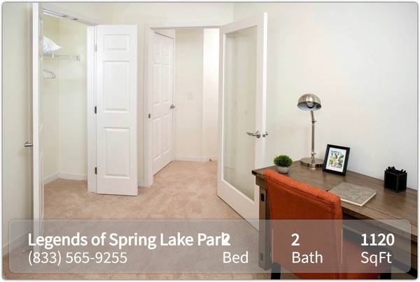 Affordable Apartment Homes for Adults 55 and Older. People love Spring Lake Park's small town charm, friendly people, and close-in location! This incredible active living community for adults 55 and older provides luxurious amenities that set the standards for quality and affordability in the North Metro. The Legends of Spring Lake Park offers 1, 2, and 3 bedroom floor plans that feature a full-size washer and dryer in every apartment, walk-in closets, granite countertops and more. Other amenities include heated underground parking, community kitchen, fitness center, card & craft room, on-site theater room, and even a beauty salon. Its the perfect combination of luxury and affordability! *The Legends Of Spring Lake Park participates in an affordable housing program. Household income & student status limitations apply. Please call for more details.