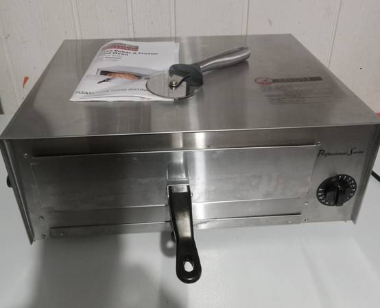 Electric Pizza Baker & Frozen Food Oven. Stainless Steel. Fits 12" Pizza. Comes with Manual and Pizza cutter. $50 cash.