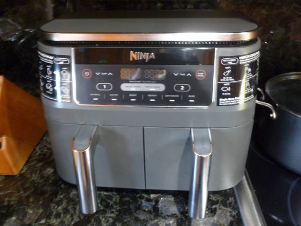 Ninja Foodie Dual Basket Air Fryer. It has many function, but what makes it fantastic is that you can cook two different foods at different times and even temperature, and you tell the machine and it will coordinate the cooking and end up at the SAME TIME! It works great! Purchased at Sams Club for over 200.00. We are downsizing, and don't have the room. A great deal for someone. Purchased less than a year ago. D series. Very easy to clean. Fast cooking! Cash Only