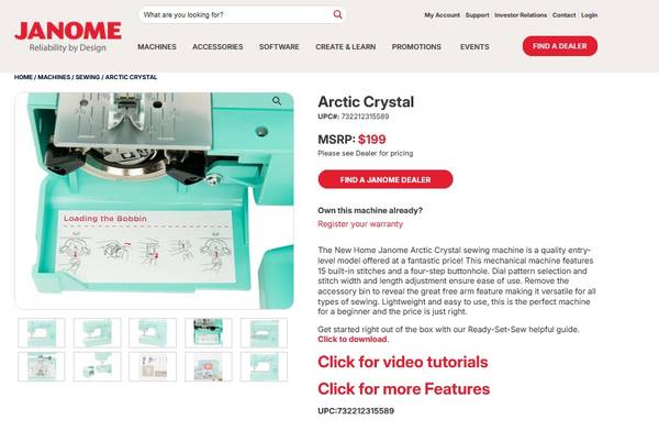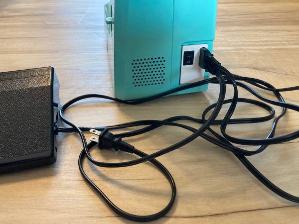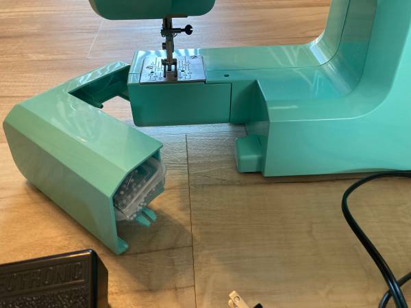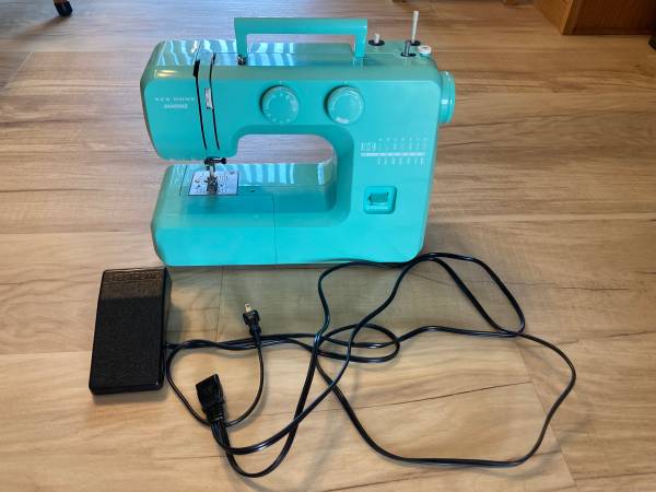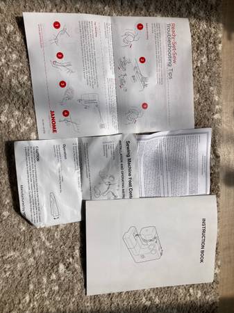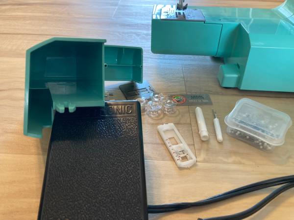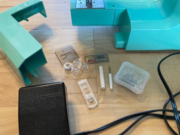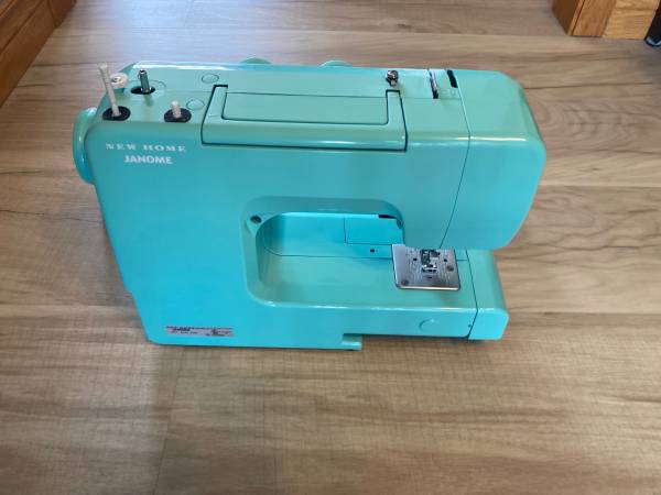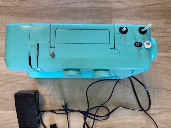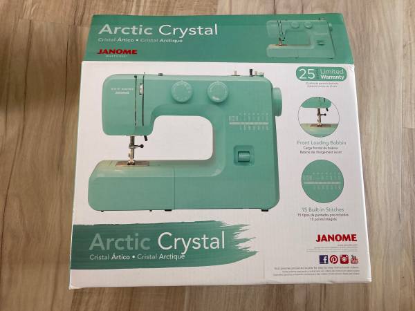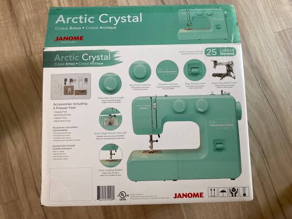 This like new Janome arctic crystal sewing machine was only used once. It's been stored in the original box I purchased it in. Everything works great! I included information from the Janome website that gives more detailed information. Carrying handle is at the top, a storage compartment is at the bottom, and the electrical cords for wall outlet and foot pedal are included. It's a mint green color and is lightweight. Manuals and how to books are included.