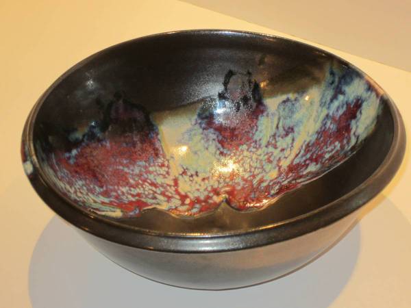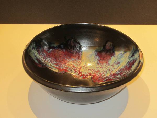 Beautiful glazed ceramic bowl. Classic style. Black glazing with red/blue/white yellow highlights. Approximately 4-1/2 inches tall by 10-1/2 inches in diameter.