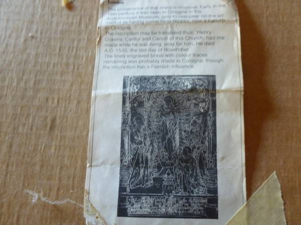 Beautiful brass rubbing done in the 19th century of Canon Henry Oskens 1535. This original brass is now located at the Victoria and Albert Museum. It depicts Henry kneeling at the feet of Madonna with Christ Child. 26 X 40inches. Very hard to get the right light to get a good photo. Hope you can see how beautiful it is, Cash Only