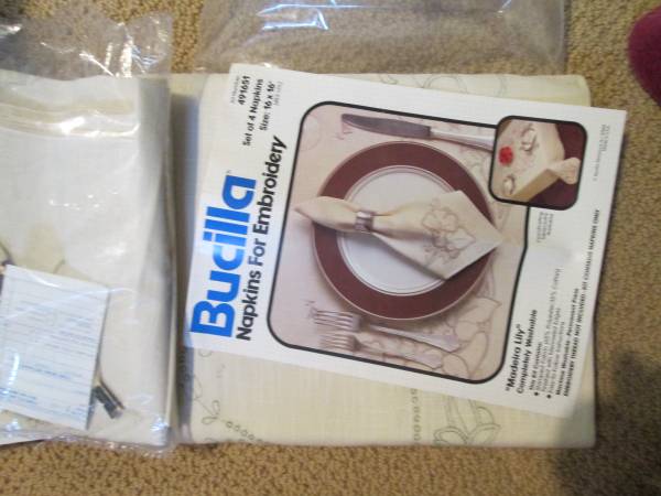 I have a vintage, new, never worked on large tablecloth Aprox 90 X 60 and 6 napkins, one completed. Some yarn included. Great project for the needlework person! Cash Only 50.00 for both the tablecloth and napkins and that is the retail price for only 4 napkins...so a deal for someone! Cash Only