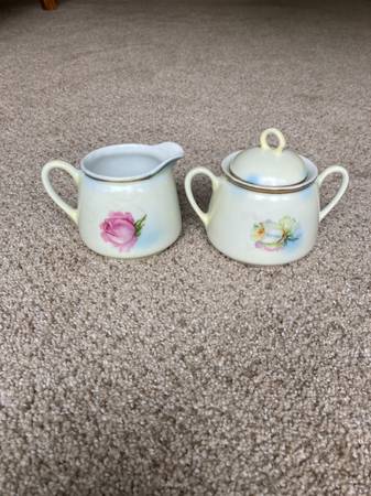 Three Crown floral china sugar and creamer set. Germany 4" base, 3.5" height No cracks or chips One floral teacup All for $15