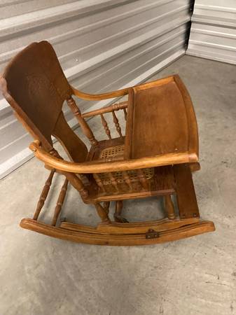 Up for sale is a unique Victorian era child's high chair, which is a combination chair that changes to a rocker with a pull of a lever in the back. The chair is made of oak with an engraved patterned back, spindled sides, and cane seat. When used as a high chair it measures 40" tall, when changed to a rocking chair it is 26" tall. The chair is 17" across and 28" deep when the rockers are extended.