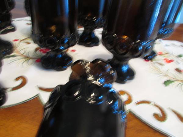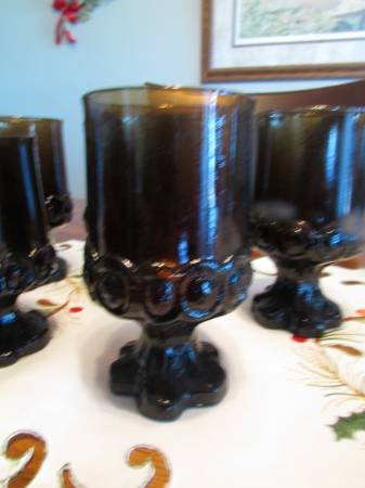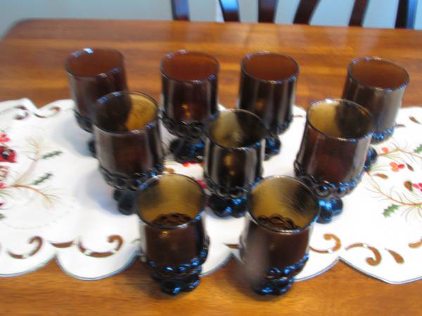 6 glasses 5.5 inches tall by 3 inch diameter at the top rim and 3 glasses 5 inches tall by 2.5 inches diameter at the top rim. All 9 glasses are in the same pattern and look exactly like Avon glasses that I found on line that are listed online for over $10 per glass. The bases are quite thick and heavy to make the glasses very stable. The round "grapes" are on the base and at the bottom of the section that holds the drink. They look like they have never been used and were found in the final clean out of a deceased friend. Fostoria glasses are also quite similar but they are usually marked and there are no identifying marks on any of the glasses. The $21 price is for all 9 but if you are interested in only some of them, please let us know what size and how many with your offered price.