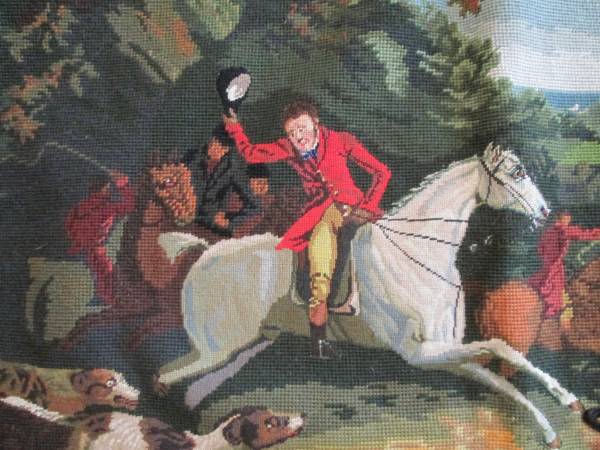 From my grandma's estate. I have a stunning needlework piece that measures 26 X 24. I think it should be in a frame, and the size is very standard. What strikes me with this piece is that the spaces for the needlework are have the size -- the large horse, person riding it and the dog -- compared to the background! The result is you have a very detailed horse and face and body and dog -- and a seamless transition to the background stitches. I love it. It is very special. Cash Only