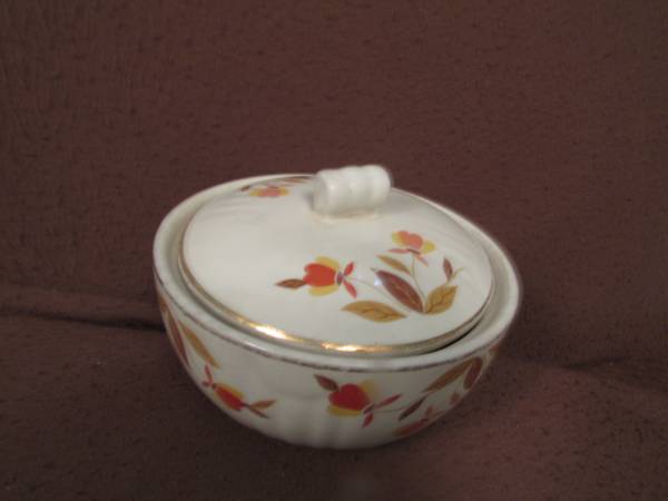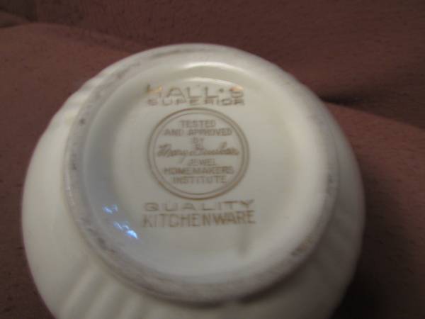 5 inch diameter Hall Superior Quality Kitchenware covered grease bowl marked "Tested and Approved by Mary Dunbar Jewel Homemakers Institute. I have found several postings of this "Autumn Leaf" pattern bowl that all list it as a "rare find" and the prices range from $24.95 to $29.00. No chips, cracks, or scratches are visible. This bowl was in the bottom of a box of miscellaneous items I bought at an auction sale. The information I could find seems to indicate it was from the 30's to the 50's era so it is around 70 to 90 years old. The gold trim around the top edge is showing loss from time and use but there is no crazing of the finish.