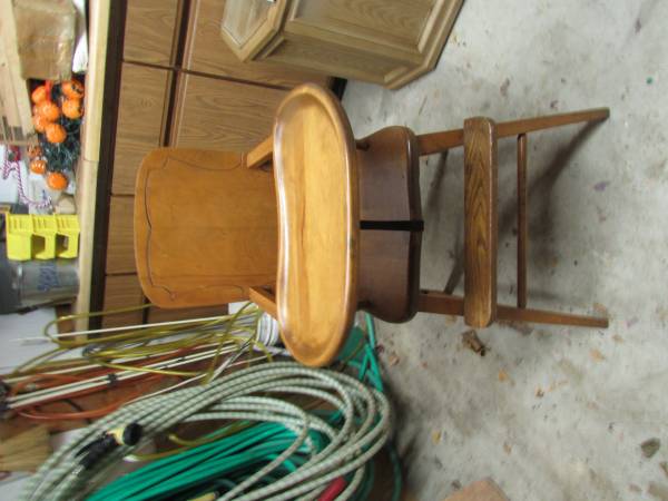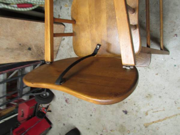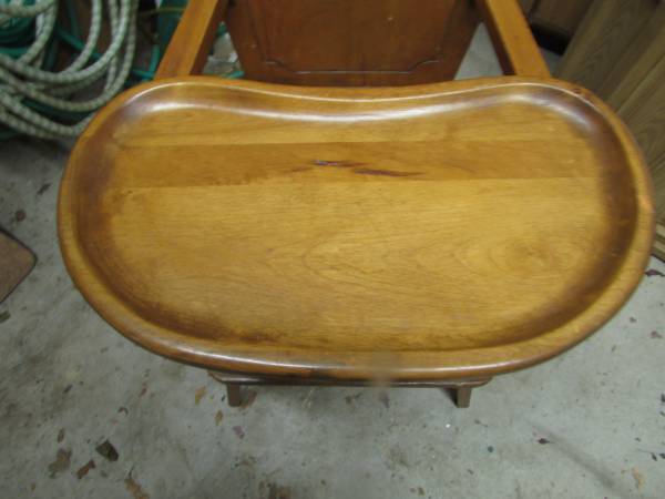 Solid backed high chair with web child leg separator that snaps under the seat for securing it in place. The chair is 37.5 inches tall and the base is four wooden legs in 20 inch square configuration. The wood tray is dished to hold minor spills in place and is held by a 3/4 inch wide web strap that snaps onto the bottom and the tray and the bottom of the seat. With the tray in place the space to the back rest is 8 inches and without the tray the seat is 12 inches deep and the footrest is 17.5 inches above the floor. The look and construction resembles high chairs from the 30's and 40's. The web and snaps has been replaced from the original and look like new. The back rest has a carved line around the perimeter and everything is clean and solid. Just reduced from $19.