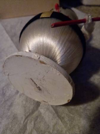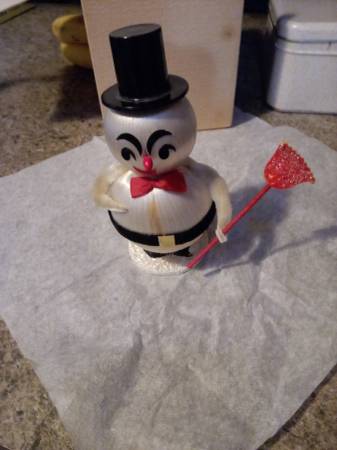 His head and body is satin thread, broom with mica glitter, plastic black top hat, black velvet belt, chenille pipe cleaner arms, red ribbon bow tie and a cardboard base with a 39 cent Japan sticker.