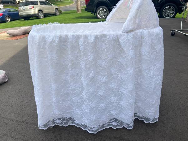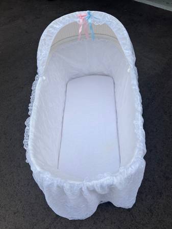 Beautiful Vintage Bassinet with removable cover hood and pure white lace. With Original Box. Excellent condition. Sturdy and still looks new. Comes with mattress pad and sheets. Wheels lock for additional safety.