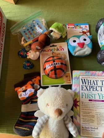 Collection of random things for kids or parents with kids. Kid meal toys, tiger socks, teddy bear, pacifier toy, pee cup protector, parenting book, stuffed monster truck, and more.