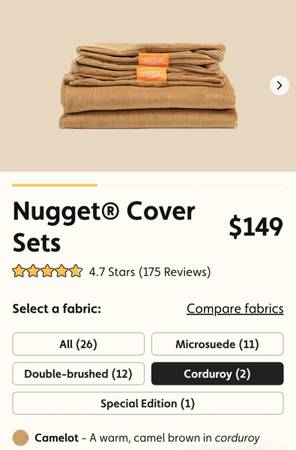 Brand new nugget cover set in Camelot a Very nice brown corduroy. This is for the cover set only, there are no cushions! We bought put it on, and realized the color didn't fit our decor, and took it...