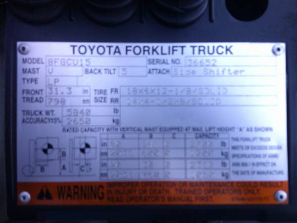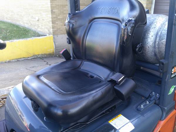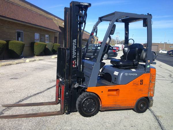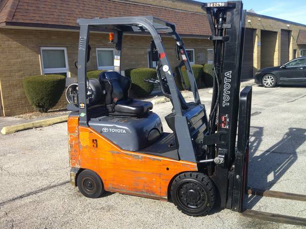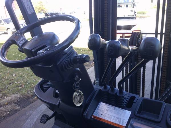 3000 LB. Capacity 2018 Toyota Forklift, Model # 8FGCU15, Propane gas, traction tires, 2877 hrs., three stage mast, max lift height is 15'-9" high, side shift, 42" forks, digital display, lights, good seat, dual mirrors, ideal model for operating inside the warehouse, we can offer delivery, propane tank is extra, asking $10,550., contact is Tim.