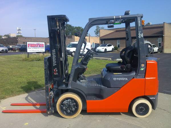 5K LB. Capacity Toyota Forklift, Model # 8FGCU25, propane gas, new cushion non-marking tires, only 3180 hrs., 3 tier mast, max lift height is 15'-9" high side shift, 42" forks, lbr., lights, strobe light, back up alarm, premium seat, digital display turn signals, green side running lights, rear blue safety spotlight, two units to choose from, we can deliver, asking $11,975., contact is Tim.