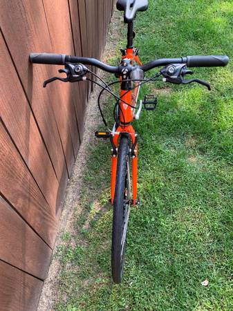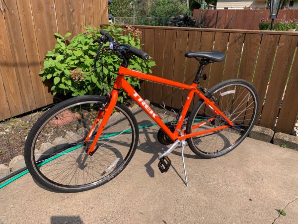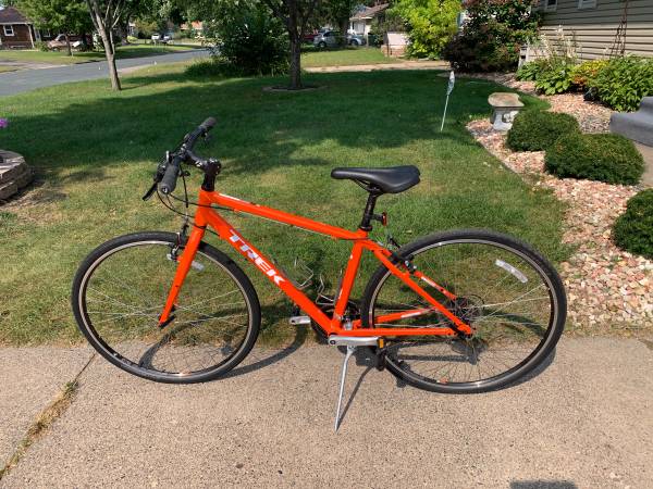 LIKE NEW Trek Hybrid, Original Owner, Bontrager Tires @ 85 % Tread, Aluminum High Performance Rims. No Rips // Holes In Seat, Includes ( 2 ) Bontrager Water Bottle Cages, Quick Release Front And Rear Hub, Shimano Derailleur Components, Thumb Shifters, Ultra Comfort Hand Grips, Fully Adjustable Seat, No Broken Parts……Or Missing Pieces, Very Minimal Use, Always Stored Indoors, Rides…..Shifts…..Brakes……Flawless, Steel Frame, No Scratches Or Flaws, Kickstand, 26” Wheels, Lightweight, Orange Crush Color, High Performance, Ready To Ride!!!……..CALL OR TEXT TO PICKUP **** PRICE FIRM **** CASH ONLY *** NO DELIVERY *** NO SCAMMERS ****