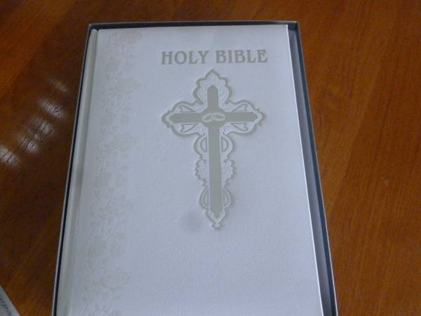 New in box white leather bonded cover, silver gilded pages, Scripture and reading for the wedding, Family record section and stories for Easter and the Eucharist. A treasure. Price on book box is 62.95. Cash Only