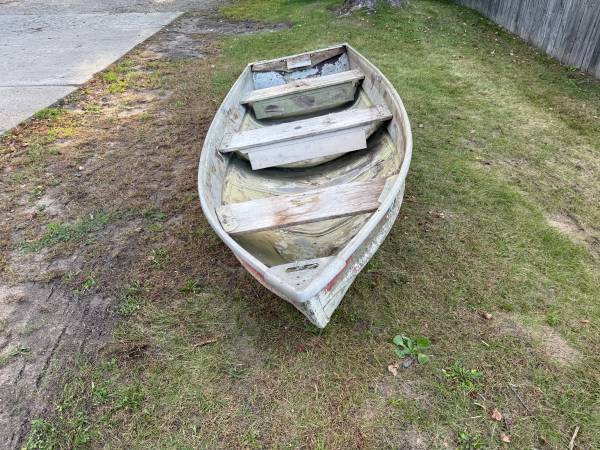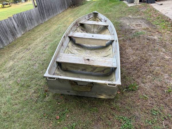 12 foot SeaKing aluminum boat. Sold as is. It has leaks in the bow seam and also along the rear seams in the sides. Great for your yard art project or whatever you can imagine. Or fix the leaks if...