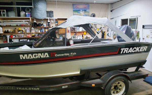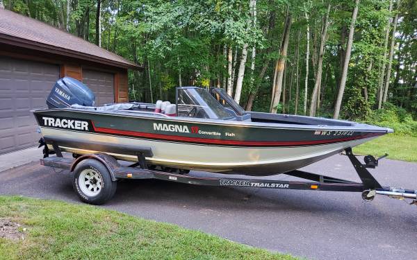 17 ft tracker magna. Comes with a 115 horse Yamaha four-stroke fuel injected motor. Custom tracker trailer star trailer. Motor is a 2005 with minimum hours and has been taken very good care of buy dealer. Boat has been kept indoors when not used or under a canopy. Boat comes with a depth finder. Color with GPS. Gas gauge. Battery gauge. Full travel cover in very good condition. Running lights. Lockable rod storage. Two matching seats. Live well. Roller bunk trailer with a 2-in ball. Bearing buddies on the axles. Axles bearings serviced and replaced.Convertible top no side windows. I will remove this ad when it is sold and I do not need help selling this from any dealer thank you for looking. James 6one2247one00one.