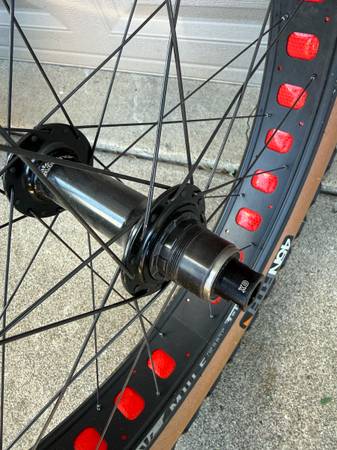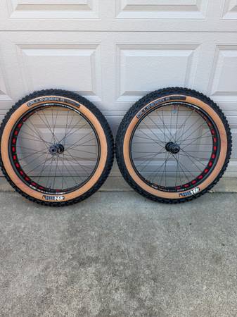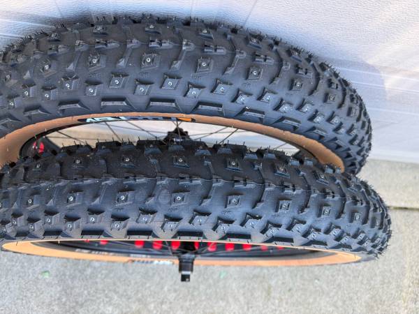 Brand new fat bike Wheelset, $1200 retail. 45 NRTH Studded tan wall D5’s (26x4.6) on SUN ringle MuleFut 80 SL rims. XD driver, 6-bolt SRC hubs (150/197), red reflective rim strip with red and blue Muc-Off valves. Pickup in Blaine, MN or may be able to meet in Hayward, WI area also. Message me with any questions. Thanks for looking!