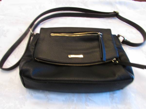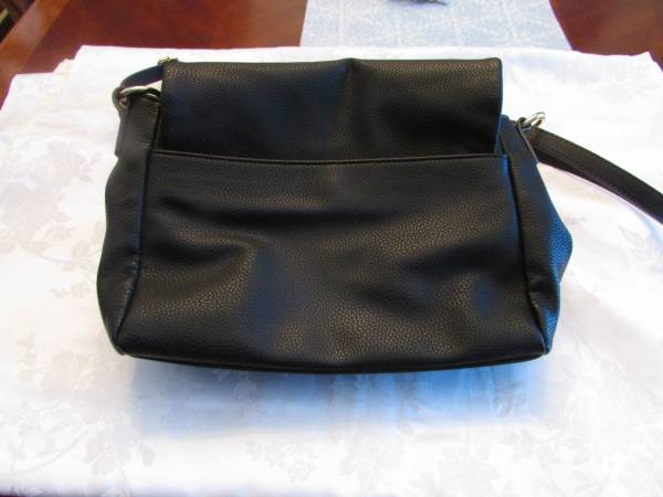 New black over the shoulder style Liz Claiborne purse with adjustable strap and 6 compartments. The Liz Claiborne purse was purchased a few months ago and is in like new condition. The Liz Claiborne purse measures 13 inches wide by 9 inches tall. This purse originally cost $145 on sale
