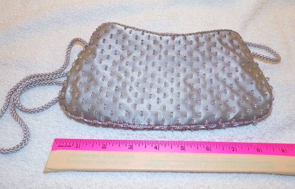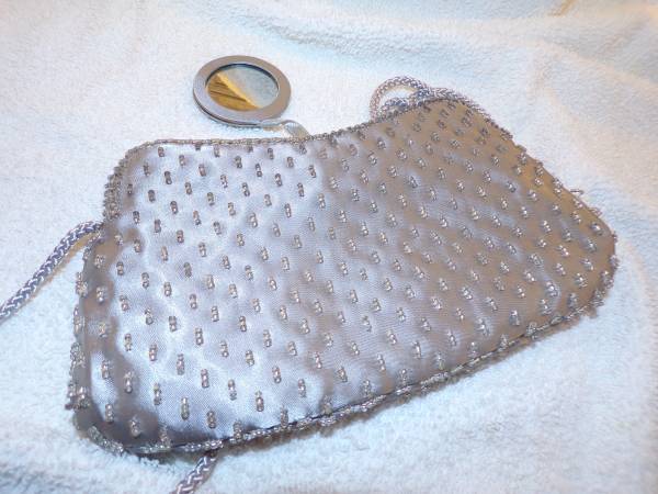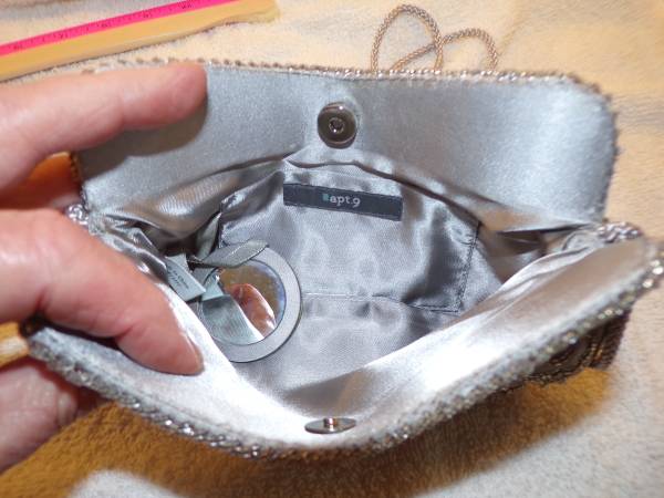 Ladies dressy beaded silver/gray handbag. Like new, used once. Perfect for the holidays. Apt. 9 brand. Clutch or shoulder strap (40"L, braided). 8.5" wide, 5" high, 1" deep but expands to about fit size of woman's medium fist. Large, secure snap closure. Silver satin inside with open side pocket. Round 1.5" mirror attached w/ribbon. It is in perfect condition. Like new, used once. Perfect for the holidays, weddings and special occasions. Cash or Venmo - only w/pick up Mounds View or Roseville, MN
