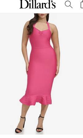 New. Upon a very close inspection I noticed there are two small lines in the fabric and one in the halter top part as shown in the closeup of the final image where it is on the counter on the hanger. Shown in the Dillards ad as well as I did quick take a picture to show. Cute Valentine’s Day or Easter fancy to semi casual hot pink dress. Bandage knit, women’s halter neck dress of year-round style: Wear this dress from spring into summer or layered under a sweatshirt or blazer when the weather cools. Never worn beyond for a picture to sell. New one year ago. Non smoking home. Convenient pick up just off interstate 35 near the Village Inn in Wyoming, Minnesota.