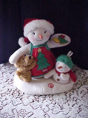 2015 "Time for Cookies". This one is very hard to find and very adorable. Mom in an apron and a plate of cookies with a small snowman and a dog. Music works and has great action. $25.00