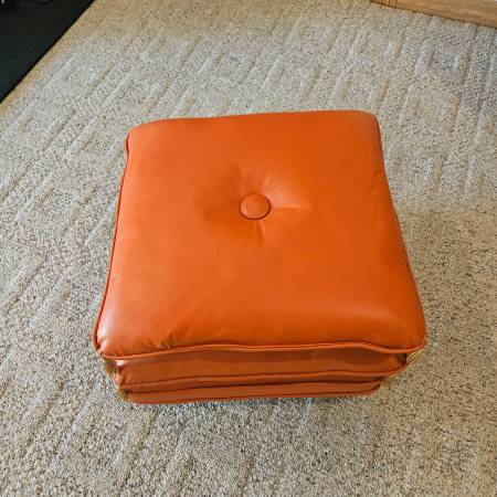 Vintage Mid Century Stacked Pillow Ottoman. Double Floor Pillow Soft Vinyl Orange Square Cushions on legged Foot Stool. 20" Square. 14" High with both cushions. Cash Only