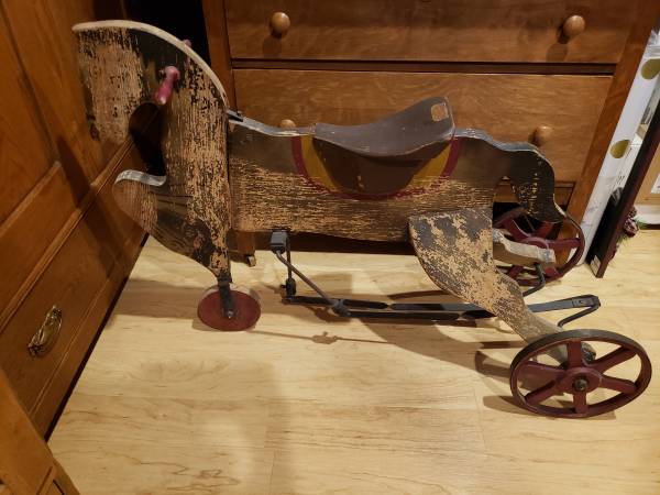 Antique Wooden Ride On Horse Child's Toy 1 pedal is missing. The other is detached. One of the handles is re-attached. Paint loss. $300 Cash only