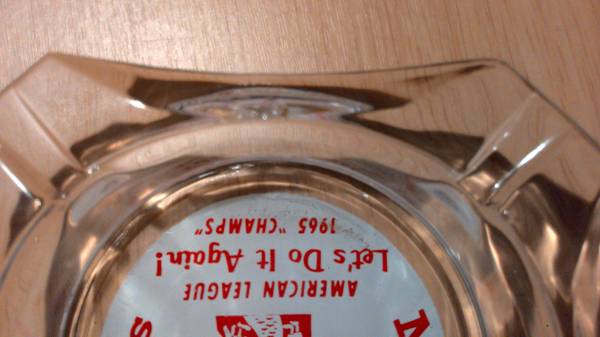 1966 Minnesota Twins ash tray saying 1965 American League Champs - Let's do it again! I do not see this one often. This one is not mint. It does have a chip on the inner edge on the bottom and parts of the image show some wear. It is made of glass and is about 4"x4"