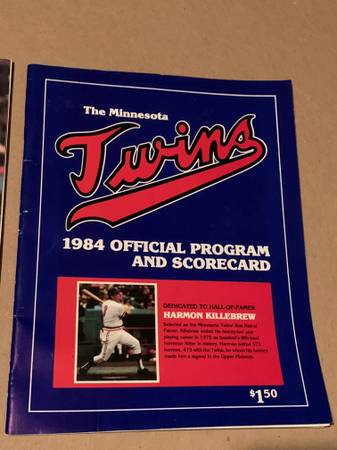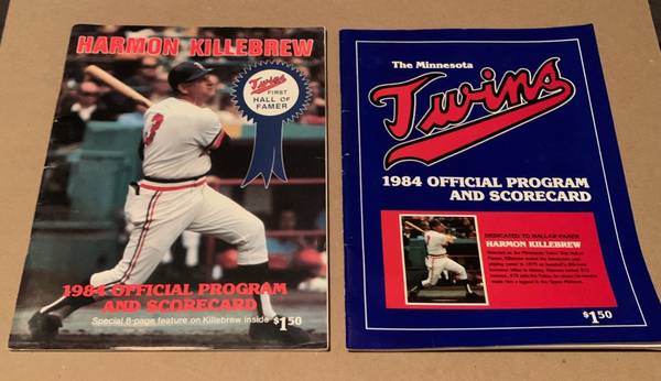 Two 1984 Minnesota Twins programs with Harmon Killebrew on the cover. The first one has a crease down the middle of the cover and another one in the bottom corner. Also, has a crease on the back cover in the corner. The second one with the small Killebrew image is in good condition.