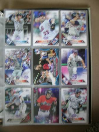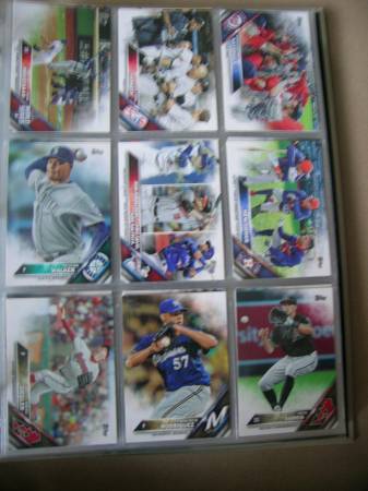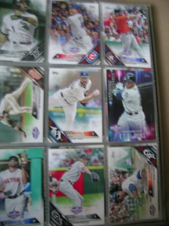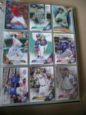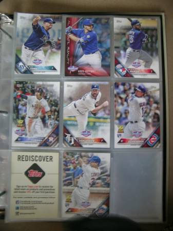 Baseball binder with pages and cards. Some of the pages are ripping apart, but most are ok and will protect the card. Includes 79 2016 Topps, some stars. Also, includes about 30 empty pages.