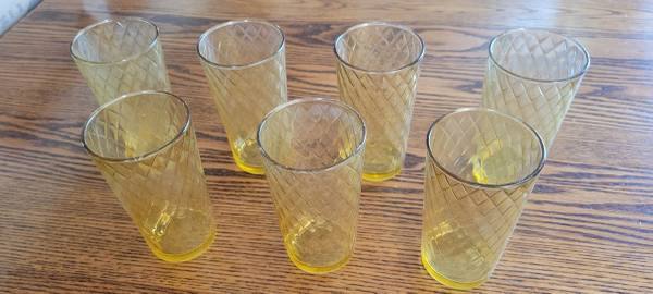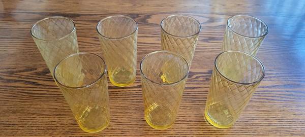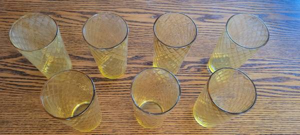 7 Amber Depression Glass Tumblers With Diamond Pattern.