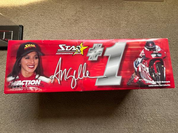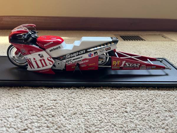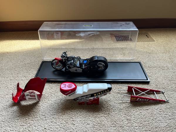 Angelle Seeling 1:9 Scale Die Cast Pro Stock Motorcycle. This model is in excellent condition and has a lot of detail. Also comes with a display case. $40 or B/O.