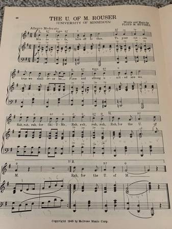 Music book from 1945 containing the music to all the Big 10 school songs. There are some creases on the cover, writing in the cover, where the price is, and a small rip on the back cover. There is also writing throughout under the notes. Looks like it was used to practice playing the music. The writing appears to be in pencil.