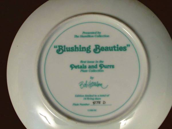 The Hamilton Collection, Petals and Purrs plate collection of "Blushing Beauties" by Bob Harrison. This limited edition plate is numbered 4175D and has a 1988 hallmark. The plate shows both a lovely rose and a cat and is in like new condition. The gilt edge is complete and the plate shows no scratches or imperfections. The identical plate is listed on other sites for prices ranging from $18 to $27 with most priced at $20 and we are asking about 75% of that price, and also less than the lower price. We really like the cats theme but "we have too much stuff".