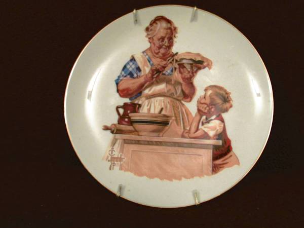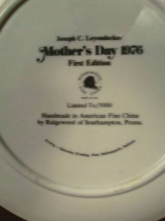 First edition Mothers Day 1976 plate by Joseph C. Leyendecker. This plate was limited to 5000 total made and was originally a cover for The Saturday Evening Post by Norman Rockwell. Manufactured by Ridgewood Fine China of Southampton, PA. Comes with spring type plate hanger and has the protective clear plastic/rubber sleeves to prevent damage to the edges of the plate. An identical plate without the hanger is listed on another site in Europe for 9.78 Euro ($10.75) plus shipping. A wonderful gift depicting a matronly Grandmother and her Grandson making a pie together. The plate is 8 1/2 inches diameter with a completely intact gilded perimeter edge and has no chips, cracks, fading, or stains. The hanger if bought individually usually costs $4 or more, and our $9 price is for both the plate and the hanger.