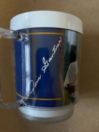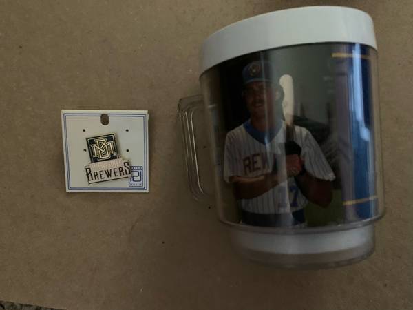 Milwaukee Brewers plastic coffee cup with Jim Gantner on it. This giveaway was sponsored by Maxwell House and WKTI 94 fm. In good shape, but there is a crack in the bottom on the inside. Also, a Milwaukee Brewers pin.