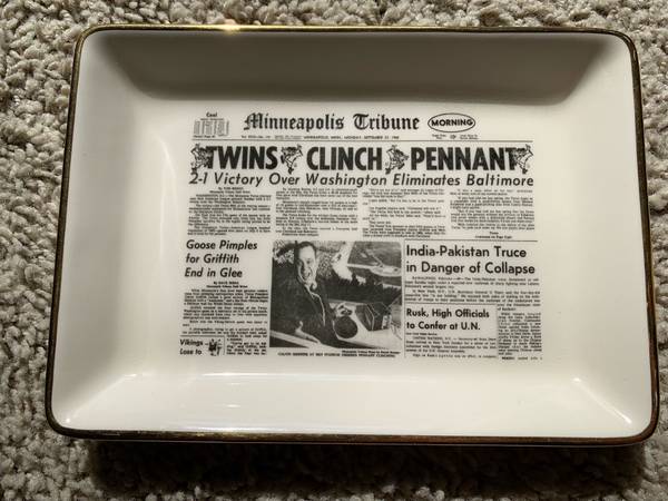 1. The first one is a 1965 Minnesota Twins dish with the Minneapolis Tribune front page from September 27th, 1965 on the face of it with the headline Twins Clinch Pennant. Not sure if this is a dish, a tray, or an ashtray. The front is in great condition. The back has a few firing marks, some wear where it touches the surface, and an indentation.