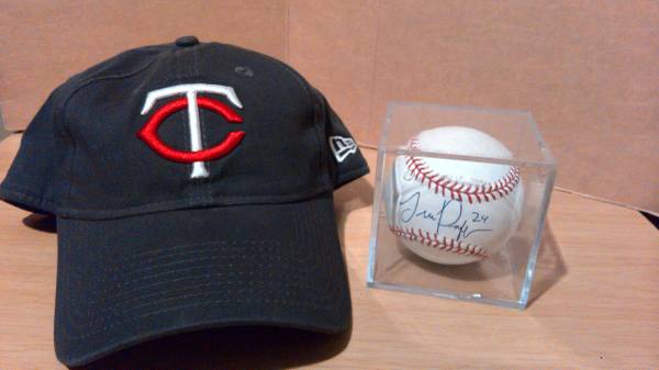 Minnesota Twins baseball cap and Trevor Plouffe autographed baseball. The hat is a New Era 49FORTY. It is fitted and the size is an x-small. It almost fits me, but would be best for a younger teenager. Also, an official league baseball signed by Trevor Plouffe. I did not get this signed and there is no COA. Comes in a case, but the case has some scratches. Both items for $30.