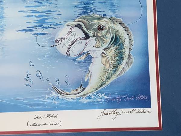 Minnesota Twins Outdoor print by Timothy Scott Altier. This is signed by both Kent Hrbek and the artist. Numbered 5/750. The certificate of authentication is on the back. The frame has a few spots on the front and some of the paper sealing the back is ripped in one place and coming unglued in a few other places. The size is 24" x 36"