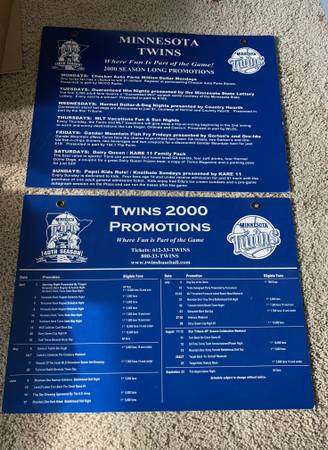 Two Minnesota Twins signs from 2000. One lists the promotions on a weekly basis and one lists the giveaways throughout the year. Made of tag board and have grommets to hang them. Probably not too many of these out there. The size of each is about 22" x 17" and they do have some wear around the edges. $50 for the pair.