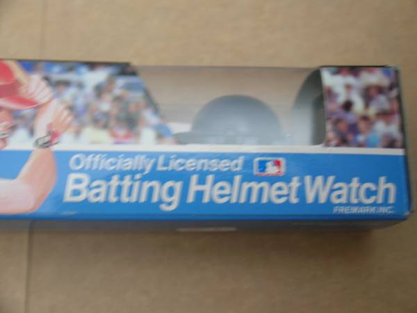 Two Minnesota Twins watches, both are new in the box. The first one is silver in color and had the old logo on the face. The screen has been damaged and there is a black spot where the time should be displayed. The second one is a batting helmet watch.