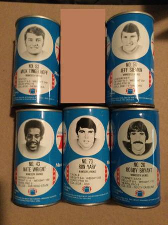 5 different 1977 Minnesota Vikings RC Cola cans. Some have a few spots and minor dents. Includes: