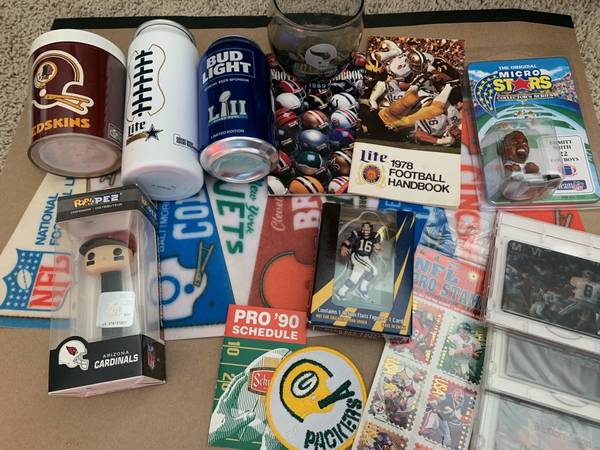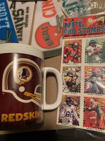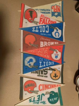 Mini pennants - some have wear and spots and creases - NFL, Atlanta Falcons, Baltimore Colts, New York Jets, Cleveland Browns, New Orleans Saints, Detroit Lions, Cincinnati Bengals, and New England Patriots